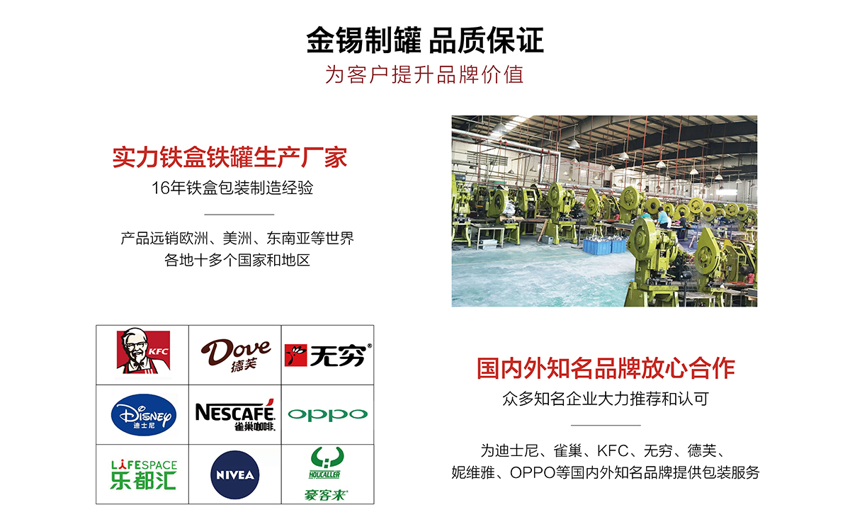 廣州市金錫五金制品有限公司成立于2016年,是已有13年生產(chǎn)經(jīng)驗的實力廠家。我廠是專業(yè)定制優(yōu)良馬口鐵盒、鐵罐、禮品盒、茶葉罐、月餅盒等金屬鐵盒包裝的制罐企業(yè),我們擁有超過6000平方米的標準現(xiàn)代化廠房及八條生產(chǎn)線。公司集產(chǎn)品研發(fā)、設(shè)計、生產(chǎn)、銷售于一體,技術(shù)優(yōu)良,實力雄厚。通過十多年的制罐經(jīng)驗,我們擁有專業(yè)的技術(shù)團隊,嚴格的作業(yè)流程、完整的品質(zhì)保障體系、完善的銷售以及售后服務(wù)系統(tǒng)。